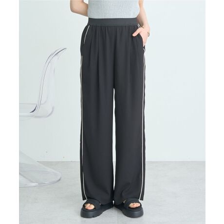 とろみのある素材感で仕立てた穿き心地の良いパンツ。サイドラインが程よくスポーティーなアクセントをプラスします。総ゴムのウエストで快適な着用感も魅力的。ややワイドながらもストンと落ちるシルエットが美しく、トップスイン・アウトのどちらでもサマ見えするおすすめのアイテムです。透け感[なし]