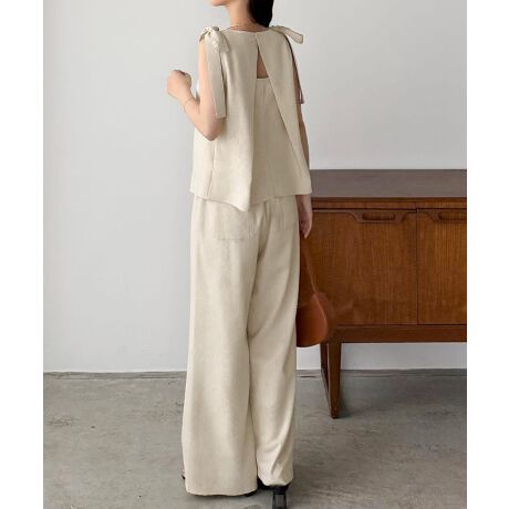callautia リネン混肩リボンバックオープンセットアップ