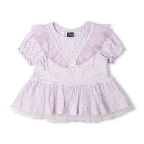 トレンドのチュールのフリルやパフスリーブが大人っぽい!小さなリボンのモチーフもポイント!ガーリーで可愛いデザインの半袖Tシャツ。襟ぐりの後ろがゴム仕様で着脱もしやすい!【アイテム】トップス シンプル ガーリー フェミニン カジュアル お洒落 オシャレ かわいい 可愛い 普段着 デイリーウェア お出かけ着 お外着 お外遊び着 子ども こども 女児 女の子 ガールズ キッズ ベビーサイズ トドラーサイズ 幼稚園 保育園 小学校 通園 通学 小学生 2025年春夏物新作 丸高衣料 オフホワイト 白色 ラベンダー パープル 薄紫色 クレセント りぼん