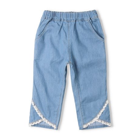 膝が隠れる膝下7分丈。どんなトップスにも合わせやすいシンプルデザインのパンツ。オフホワイトはツイル素材で裾にはギンガムチェック柄のリボンのレースアップデザイン。ブルーはデニム素材で裾にはチュールレース付。【アイテム】ナチュラル シンプル ベーシック フェミニン ガーリー 無地 カジュアル お洒落 オシャレ かわいい 大人可愛い 普段着 デイリーウェア お出かけ着 お外着 外遊び着 ハーフパンツ 短パン 半パン 半ズボン ボトムス 子ども こども 女児 女の子 ガールズ キッズ ベビーサイズ トドラーサイズ 幼稚園 保育園 小学校 通園 通学 小学生 2024年春夏物新作 丸高衣料 白色 青色 クレセント りぼん