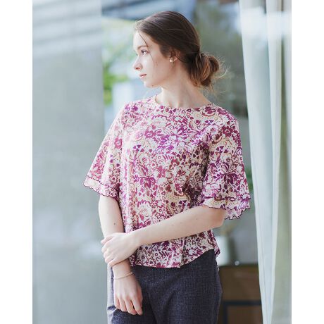 袖口のメローをアクセントにしたベルスリーブがフェミニン感をプラスします。