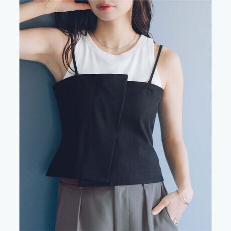 ・構築的な折り返しデザインでコーディネートのポイントになるキャミソールトップス・肩紐は長さ調整や取り外しも可能で、お好みでビスチェとしてもご着用いただけます・後ろはシャーリング仕様になっており、体のフィット感はレースアップリボン部分で調整可能です・シンプルなトップスに重ねれば、一気におしゃれ見えするアクセントアイテム・程よい厚みの合繊ツイル素材で、高見えするのもうれしいポイント[型番:AFXP4349]