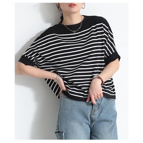 【トップス】 カットソー ニット ボーダー ドルマン 半袖 クロップド ブラック ホワイト 春 夏