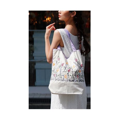持つだけで気分が弾む彩りチューリップ刺繍の撥水加工バッグ。色とりどりなチューリップの刺繍がステキなバッグです。表面は撥水加工が施されているので汚れにくく安心。底がファスナーで仕切られており履き物を収納できます。ペットボトルもすっぽり入るのでお出かけの必需品が楽々入ります。