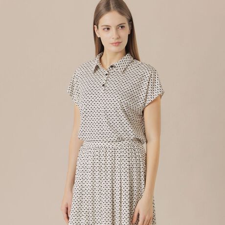 プリントのジャージ素材にポロカラーデザインをのせ、新鮮な雰囲気に仕上げたプルオーバーです。コンパクトな丈感でパンツからスカートまで様々なボトムスと相性良く、幅広いコーディネートにお使いいただける便利なアイテムです。同素材のスカート(品番:G5S63586)とセットアップで着用いただくのもおすすめです。また、ワンピース(品番:G5J68586)もご用意しております。