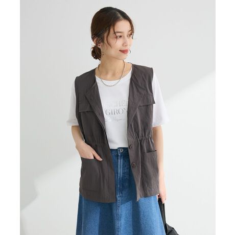 ミリタリーテイストのデザインが洒落感のあるベスト。やや光沢のある生地で仕立て、カジュアルになりすぎずフェミニンなスカートなどにも合わせていただけます。ドロスト仕様のウエストを絞って、お好みのシルエットに変えられるのも魅力的。いつものスタイリングに合わせるだけで印象的な着こなしが完成するおすすめのプラスワンアイテムです。透け感[なし]