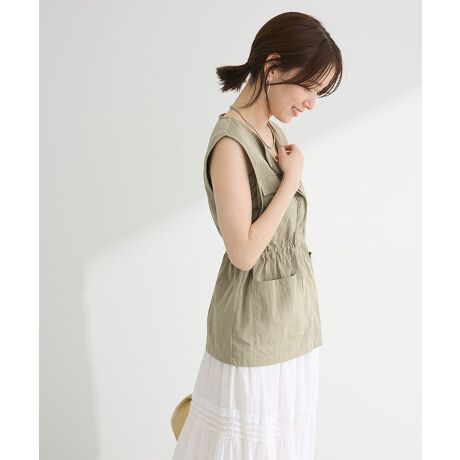 ミリタリーテイストのデザインが洒落感のあるベスト。やや光沢のある生地で仕立て、カジュアルになりすぎずフェミニンなスカートなどにも合わせていただけます。ドロスト仕様のウエストを絞って、お好みのシルエットに変えられるのも魅力的。いつものスタイリングに合わせるだけで印象的な着こなしが完成するおすすめのプラスワンアイテムです。透け感[なし]