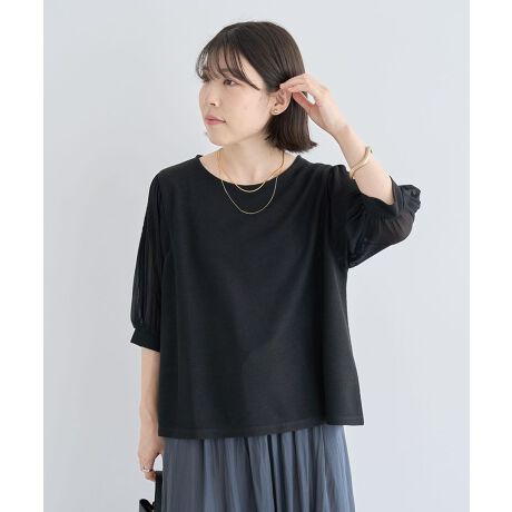 透け感あるマジョリカスリーブがシーズナルなプルオーバー。ゆったりとしたフォルムの着合わせしやすい丈感も嬉しいポイントです。細畝の凹凸感あるさらりとしたテキスタイルで肌離れもよく快適な着心地。ワントーンカラーでスタイリングしやすく、カジュアルからきれい目スタイルまで幅広く活躍してくれます。透け感[ややあり]