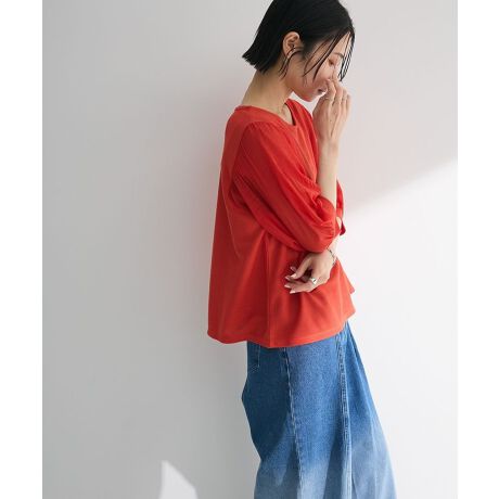 透け感あるマジョリカスリーブがシーズナルなプルオーバー。ゆったりとしたフォルムの着合わせしやすい丈感も嬉しいポイントです。細畝の凹凸感あるさらりとしたテキスタイルで肌離れもよく快適な着心地。ワントーンカラーでスタイリングしやすく、カジュアルからきれい目スタイルまで幅広く活躍してくれます。透け感[ややあり]