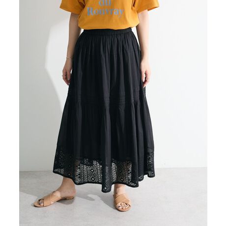 ナチュラルなコットン素材で仕立たエアリーなスカート。トレンド感あるティアードデザインはピンタックを効かせて品のある雰囲気に仕上げました。裾には繊細なレースヨークをプラスしてヘルシーな抜け感をプラス。ウエストゴムのリラクシーな穿き心地でカジュアルに合わせていただける着回し力の高いひと品です。透け感[ややあり]