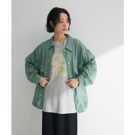 清涼感溢れるシアー素材のGジャン風ジャケット。配色ステッチを効かせカジュアルな雰囲気に仕上げました。マットに艶めくメタルボタンでアクセントをプラス。ゆったりとしたオーバーシルエットで着こなしやすく、軽やか素材感が春夏シーズンにぴったりのライトアウターです。透け感[あり]