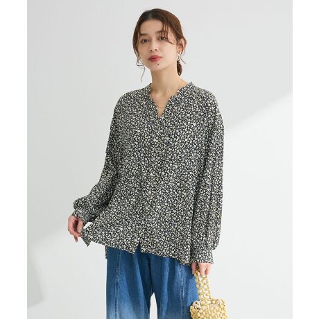 さらりとした素材が快適な着心地を叶えるデザインブラウス。抜け感のあるスキッパーネックで、女性らしさを演出します。カフ付きできれいめながらもさっと袖まくり出来るゴム仕様に。目を惹く華やかな小付き柄がコーディネートのアクセントにぴったりなおすすめのアイテムです。透け感[なし]