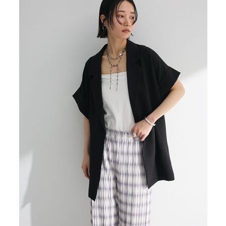 さっと羽織ってサマになるこなれ感たっぷりのデザインジャケット。大きめラペルにボタンレス仕様でロールアップしたショートスリーブが旬スタイルを後押しします。ナチュラルな雰囲気の軽量素材で涼しげなスタイリングを演出。ゆったりとしたシルエットで着回し力に優れたワードローブにプラスしておきたいおすすめアイテムです。透け感[なし]