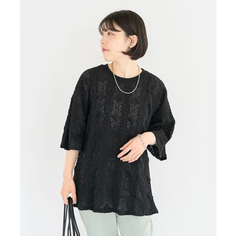 ポコポコとした素材感のカットレース生地が目を惹くTシャツ。ゆとりのあるサイズ感で身体のラインを拾いにくく、華奢に見せてくれるのも嬉しいポイントです。サイドスリット入りでボトムインしやすいのも魅力的。合わせ方次第でカジュアルからフェミニンまで幅広いスタイリングに活躍するおすすめのアイテムです。透け感[ややあり]