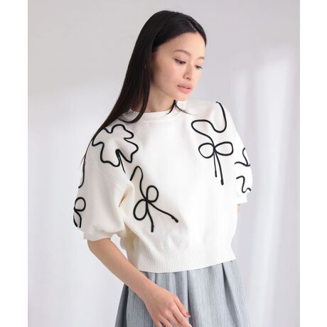 ・ELENCARE DUE ライン刺繍5分袖ニット