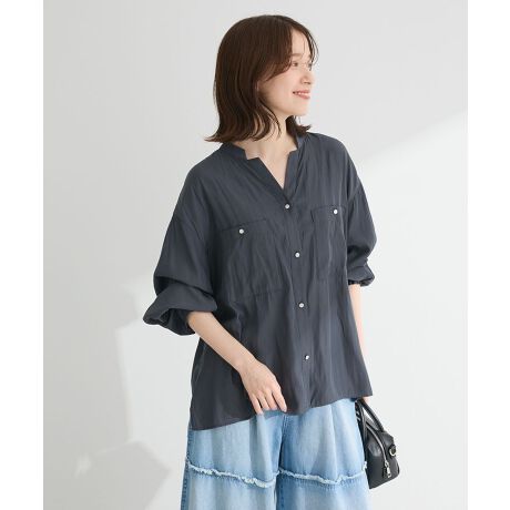 肌触りのさらりとした素材で仕立てた着心地の良いブラウス。程よく存在感のある胸ポケットや艶のあるメタルボタンが洒落感のあるポイントです。袖口はゴム使用でブラウジングしても落ちにくく、簡単にこなれた着こなしができるのも魅力的。デイリーにはもちろん、合わせ方次第でオフィスシーンにも活躍するおすすめのアイテムです。透け感[ややあり]