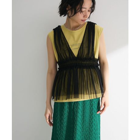 これからのシーズンにぴったりなチュールデザインビスチェ。お持ちのインナーアイテムにプラスワンするだけでフェミニンな抜け感を演出します。たっぷりの甘めギャザーや、立体感のあるシャーリングディテールをプラス。旬のシアー素材がトレンドライクなレイヤードスタイルを盛り上げてくれる今季おすすめのアイテムです。透け感[あり]