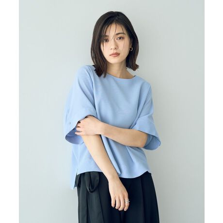 軽やかな着心地が魅力のデザインブラウス。落ち感のある袖とゆったりとしたドルマンシルエットがフェミニンな印象を引き立てます。着脱しやすいバックボタン付きで、使い勝手も抜群。シンプルなワンカラーでボトムを選ばず、デイリーからオフィスシーンまで幅広く活躍してくれるおすすめのアイテムです。透け感[ややあり]