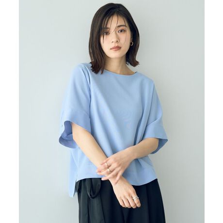 軽やかな着心地が魅力のデザインブラウス。落ち感のある袖とゆったりとしたドルマンシルエットがフェミニンな印象を引き立てます。着脱しやすいバックボタン付きで、使い勝手も抜群。シンプルなワンカラーでボトムを選ばず、デイリーからオフィスシーンまで幅広く活躍してくれるおすすめのアイテムです。透け感[ややあり]