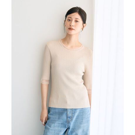 首元や袖口をシアー素材で切り替えた5分袖ニットプルオーバー。シアー部分が程よい抜け感をプラス。タイト過ぎないちょうどいいフィット感で女性らしいシルエットを演出します。メイントップとしてはもちろん、ビスチェやワンピースのインナーとしても活躍してくれるおすすめのサマーニットです。透け感[ややあり]