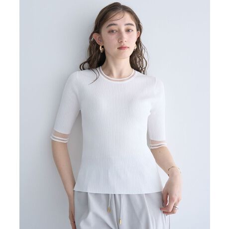 首元や袖口をシアー素材で切り替えた5分袖ニットプルオーバー。シアー部分が程よい抜け感をプラス。タイト過ぎないちょうどいいフィット感で女性らしいシルエットを演出します。メイントップとしてはもちろん、ビスチェやワンピースのインナーとしても活躍してくれるおすすめのサマーニットです。透け感[ややあり]