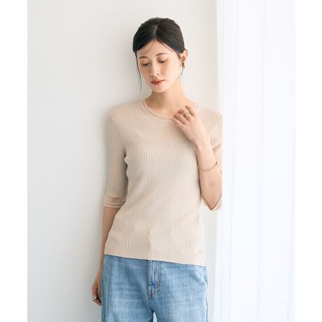 首元や袖口をシアー素材で切り替えた5分袖ニットプルオーバー。シアー部分が程よい抜け感をプラス。タイト過ぎないちょうどいいフィット感で女性らしいシルエットを演出します。メイントップとしてはもちろん、ビスチェやワンピースのインナーとしても活躍してくれるおすすめのサマーニットです。透け感[ややあり]