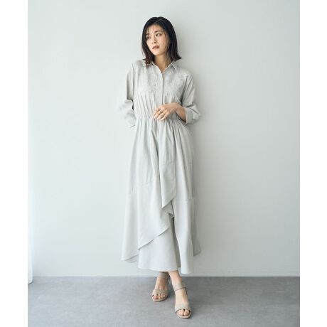 胸元に繊細なフラワーレースを施したデザインワンピース。シャープな印象のストライプ生地はシワになりにくく、落ち感のある素材が特徴。ウエストゴムで切り替えたイレギュラーヘムのラップ風スカートが、エレガントなラインを生み出します。自然なスタイルアップが期待でき、日常のカジュアルな外出から特別な日の装いまで幅広く活躍するアイテムです。透け感[ややあり]