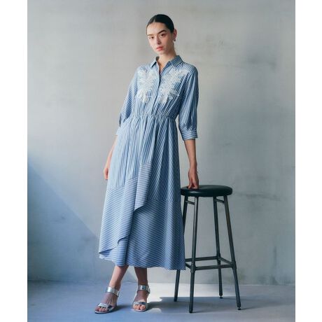 胸元に繊細なフラワーレースを施したデザインワンピース。シャープな印象のストライプ生地はシワになりにくく、落ち感のある素材が特徴。ウエストゴムで切り替えたイレギュラーヘムのラップ風スカートが、エレガントなラインを生み出します。自然なスタイルアップが期待でき、日常のカジュアルな外出から特別な日の装いまで幅広く活躍するアイテムです。透け感[ややあり]
