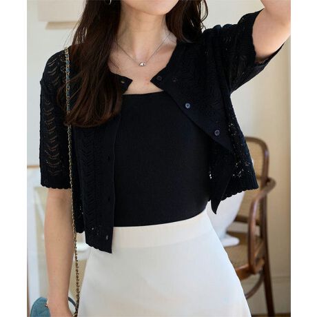細やかなディティールデザインが魅力の透かし編みカーデ。