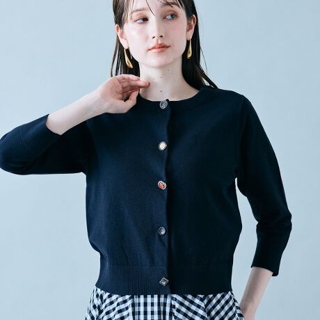 ・夏に重宝するシアーなカーディガンはフロントのビジュー釦がポイント。