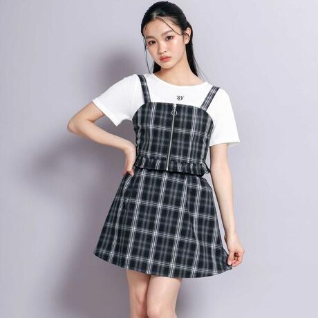 オリジナルチェックがカワイイジップ付きビスチェ、半袖Tシャツ、スカートの3点セットです。
