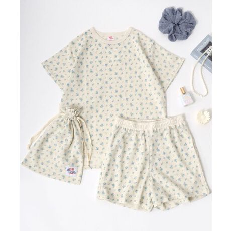 JEMORGAN/ジェーイーモーガン セットアップ 花総柄 ハート柄 ワッフル 半袖Tシャツ&ショートパンツ&ポーチ 3点セット/ルームウェア/ワンマイルウェア/パジャマ/レディース/2025SS 春夏