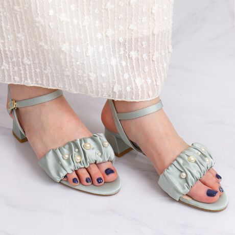 ・シャーリングに大小のパールをちりばめた、華やかで女性らしいサンダル。