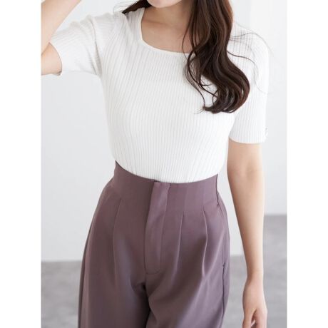 ・デコルテの映えるスクエアネックが女性らしさを引き立てるニットトップス。