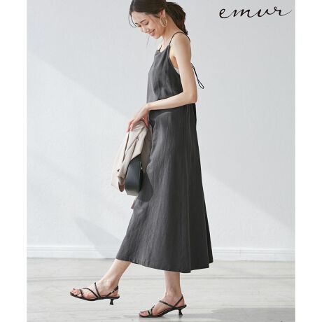 ・華奢な肩紐のキャミソールワンピース。
