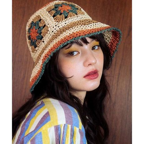 日差しの強い季節には欠かせないクロッシェハット。ベーシックなバケットタイプにお花のモチーフをパッチワーク風に組み合わせたデザインです。風通しもよく、見た目にも涼し気なペーパー素材は柔らかく軽いので持ち運びにも便利なひと品。裏部分にベルクロテープを施し、サイズ調節が出来るのも嬉しいポイントに。カラフルながらも幅広いコーディネートにマッチするようこだわった色味にも注目。※1点1点手作業のため、多少の個体差がございます。