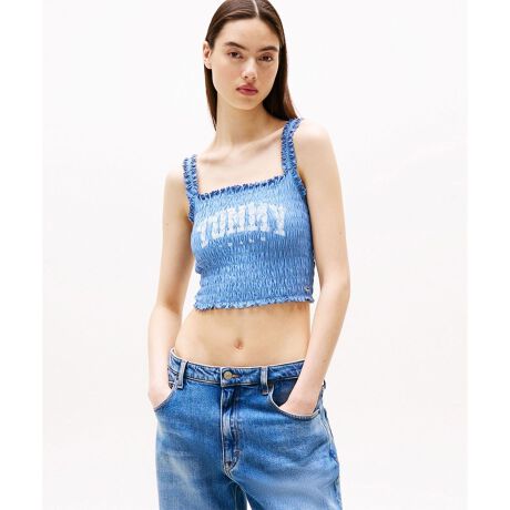 TOMMY JEANSのバーシティロゴがプリントされたブラレット。全体にスモック刺しゅうを施し、フェミニンな雰囲気もプラスしました。トリム部分はミニフリルのような仕上がりに。左裾口にはフラッグロゴのワンポイントをあしらいました。1枚でもレイヤードでも楽しめるアイテムです。