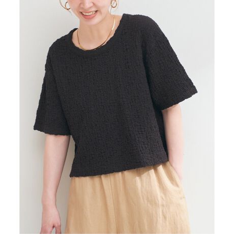 形はシンプルなTシャツ型ですが、特徴的な素材にする事でトレンドアイテムとして色んなアイテムと合わせる事が出来ますシャーリングがゴムなのでとても着やすいく、キャミワンピースのインナーとしてもお勧めです。