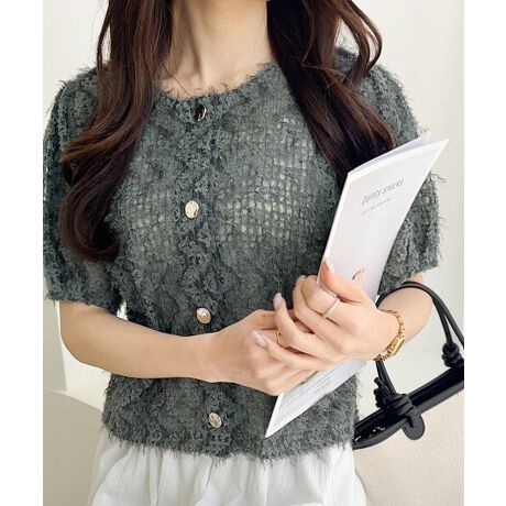 【mily bilet】大人エレガントで華やかさを。フェザーライクシアーラッセルメタルボタンブラウス