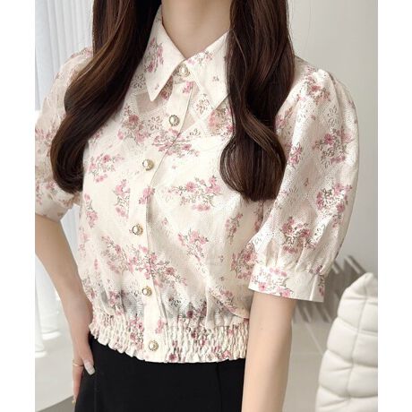 【mily bilet】スタイルアップ効果抜群♪花柄シアーレースショート丈ブラウス