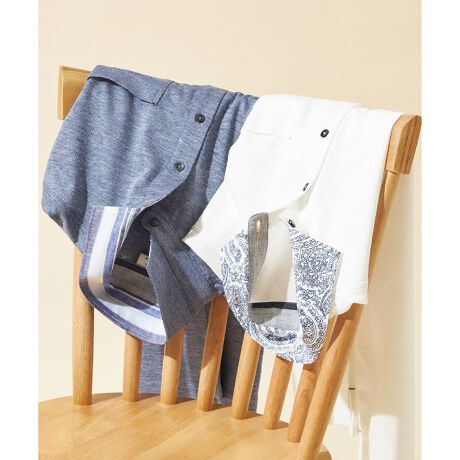 ■デザイン衿にはリネンのシャツ生地を使用。優しいトーンのカラーの組み合わせで、品良く仕上げたポロシャツです。