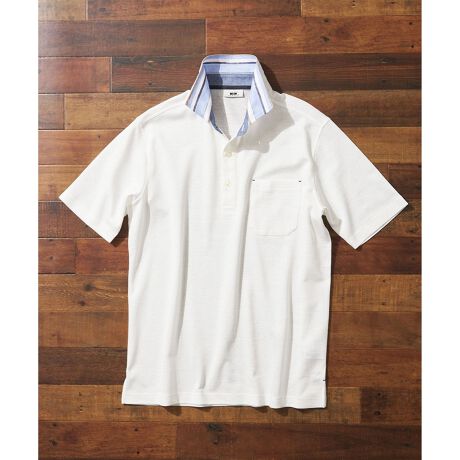 ■デザイン衿にはリネンのシャツ生地を使用。優しいトーンのカラーの組み合わせで、品良く仕上げたポロシャツです。
