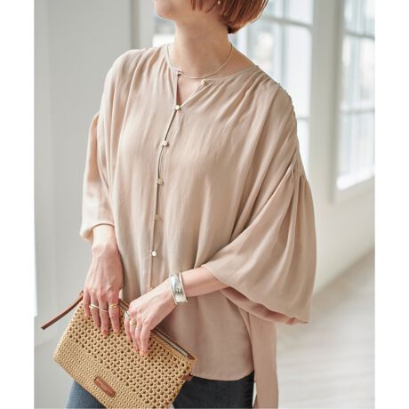 独特の落ち感とドライタッチを併せ持つある素材を使用したギャザーブラウス。