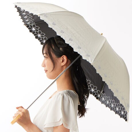 裾部分の連続したフラワー刺繍がエレガントな折り畳み傘です。