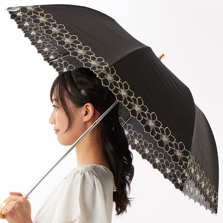 裾部分の連続したフラワー刺繍がエレガントな折り畳み傘です。