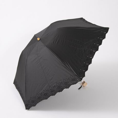 裾の部分に花柄のボーラー刺繍を施した透け感のある上品な折り畳み傘です。