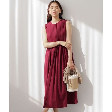 ■デザイン・ジャージー素材でありながら幅広タックのフィット&フレアシルエットがエレガント。・上品な印象が叶うよう拘ったやや詰まりぎみのクルーネック、腕をすっきり見せてくれるノースリーブデザイン。・両サイドにポケット付き