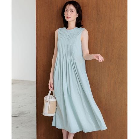 ■デザイン・ジャージー素材でありながら幅広タックのフィット&フレアシルエットがエレガント。・上品な印象が叶うよう拘ったやや詰まりぎみのクルーネック、腕をすっきり見せてくれるノースリーブデザイン。・両サイドにポケット付き