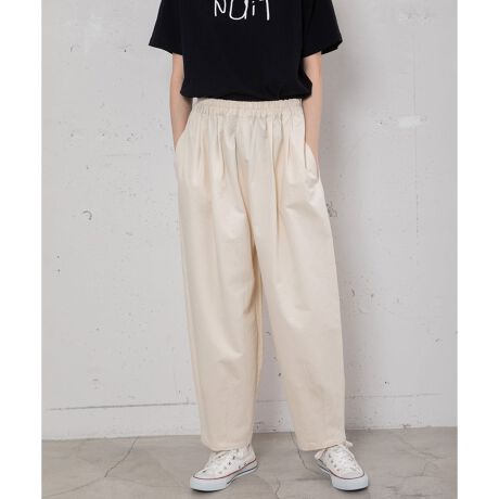 左右2本ずつタックを取った丸みのあるシルエットのパンツ。オールシーズン着まわせる程よい厚さのコットンツイルとデニム生地で仕立てました。ヒップ周りにゆとりを持たせつつ、裾はダーツを取ってすっきりとさせています。ウエストはぐるりゴム仕様。紐付きでサイズ感の調節が可能です。シンプルなデザインで着回し力も高く、デイリーユースにぴったりです。両サイドポケット付き。デニム素材は配色ステッチでカジュアルに仕上げています。