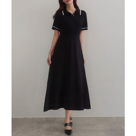 CENEA 薄手配色ラインポロニットワンピース【ペチスカートSET】
